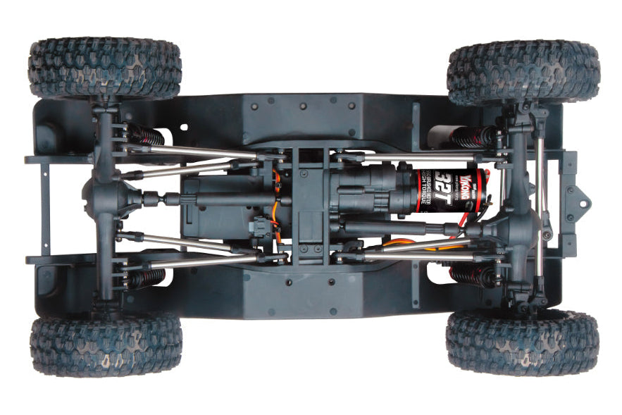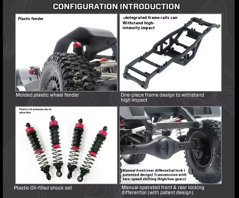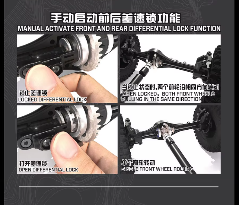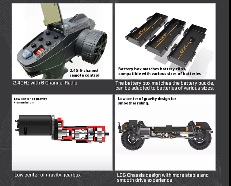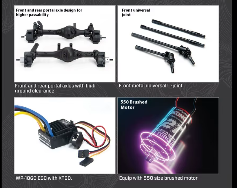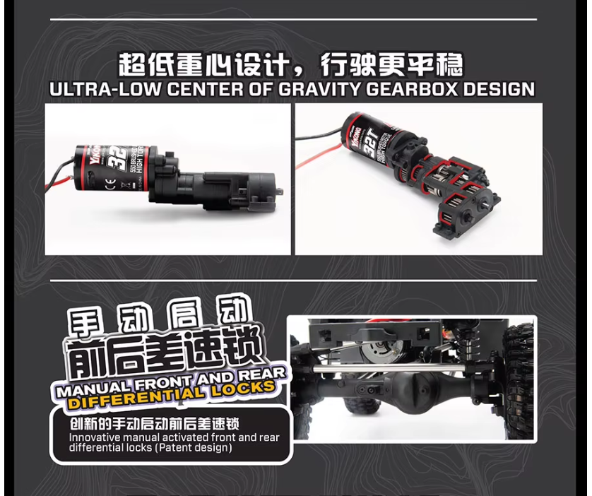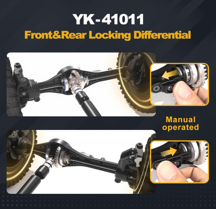 Gracias a sus portal axles metálicos, el YK41012 obtiene gran distancia al suelo y una excelente capacidad para trepar sobre rocas, raíces o desniveles. Su suspensión con amortiguadores de aceite otorga articulación suave y estabilidad en terrenos irregulares. Los diferenciales bloqueables manualmente permiten ajustar la tracción según el terreno, mientras que la transmisión LCG mejora el equilibrio del vehículo en ascensos pronunciados. La tracción 4x4 con drivetrain metálico garantiza agarre y durabilidad en condiciones extremas.