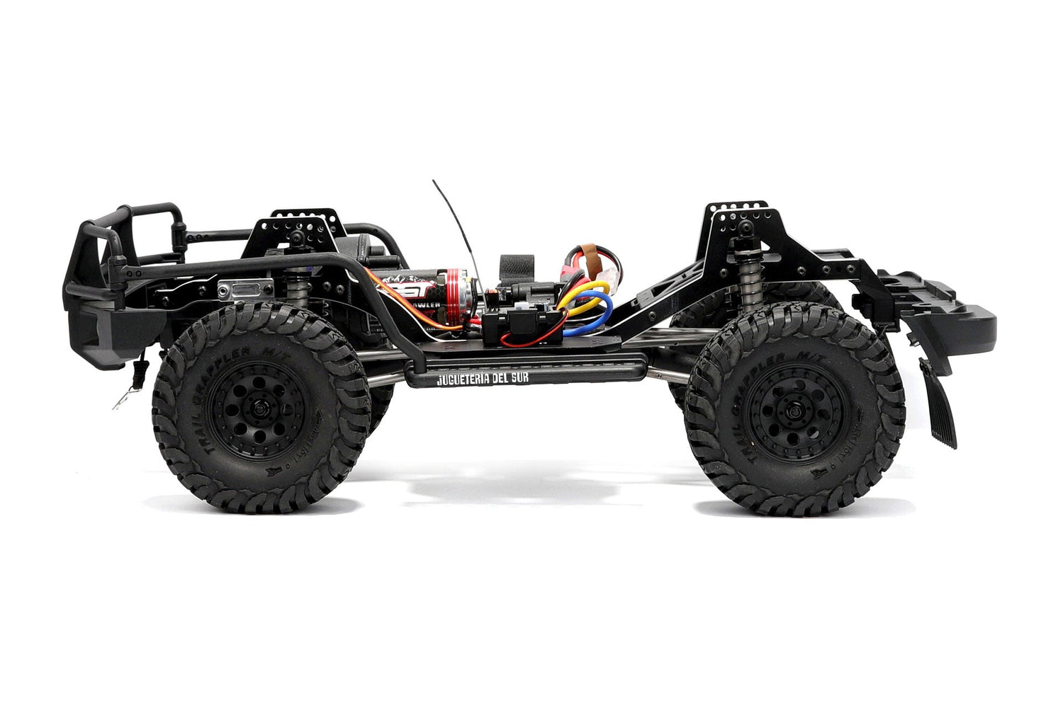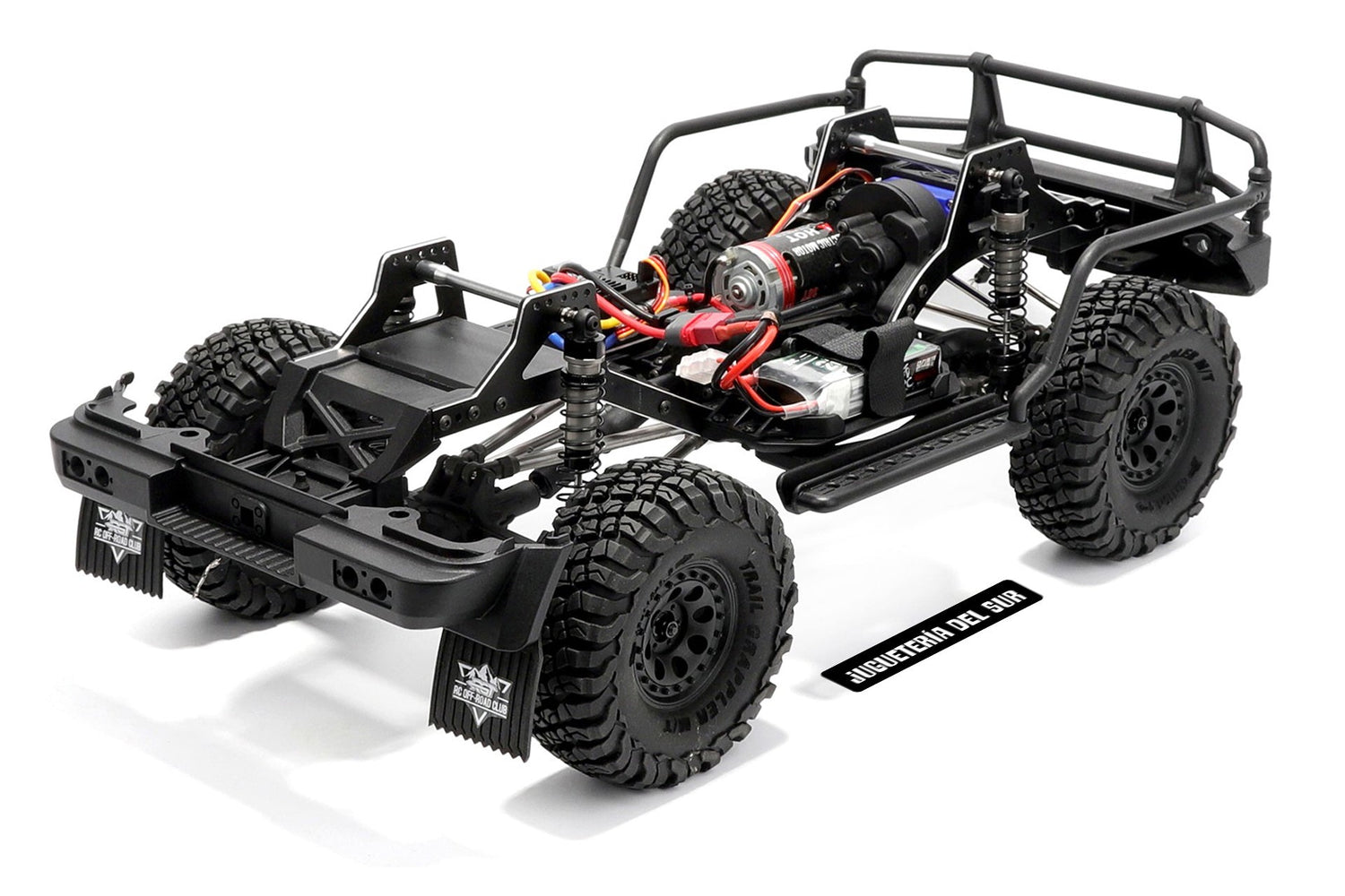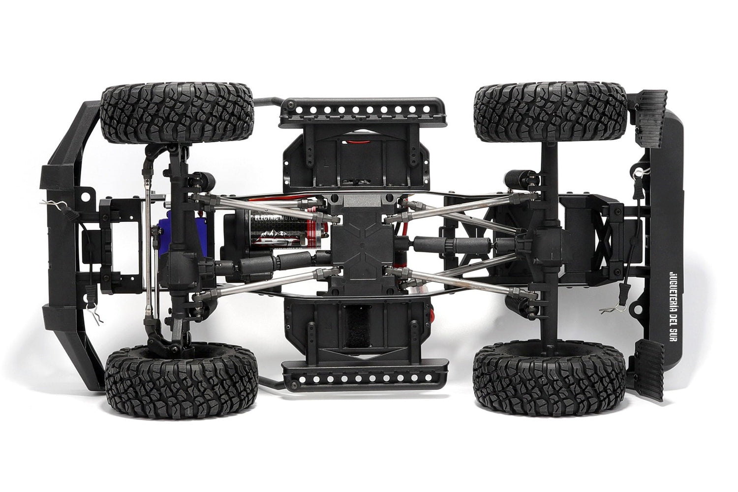 Transmisión y estructura: Chasis de aluminio CNC de 3 mm, ejes rectos integrales delantero y trasero, engranajes metálicos, conexiones sólidas (solid links), varillas de dirección reforzadas, reducción de acero #45