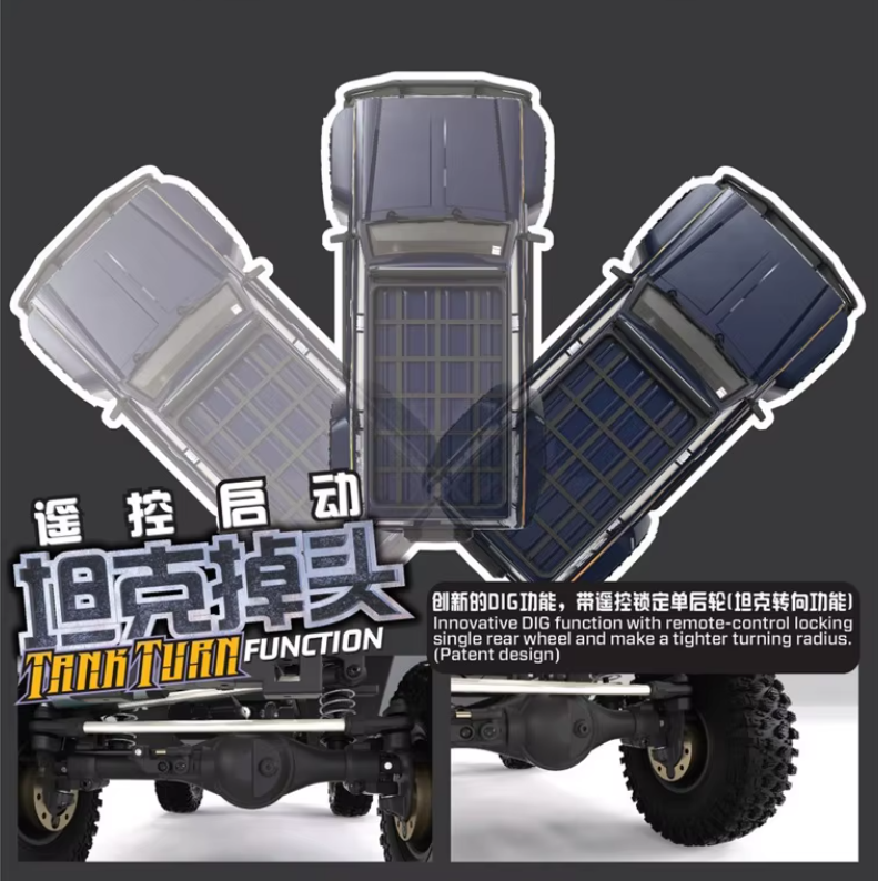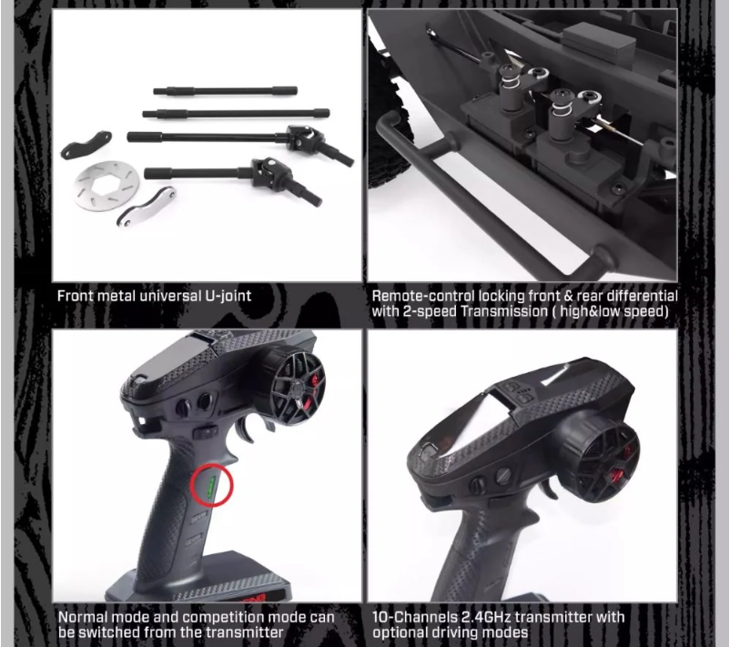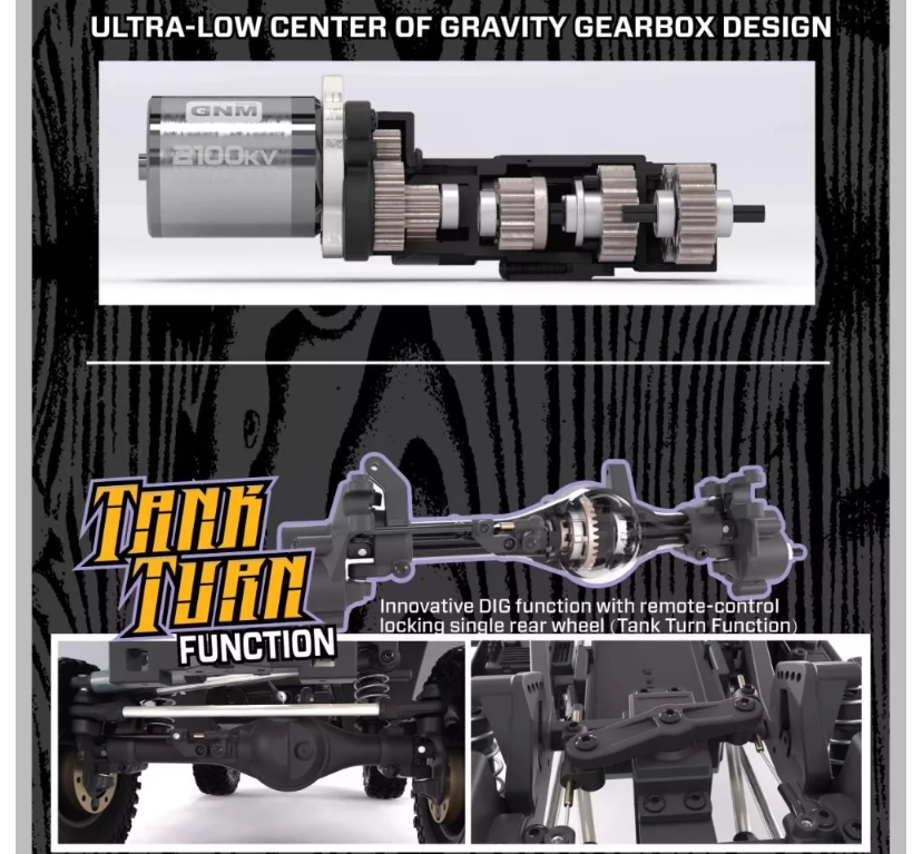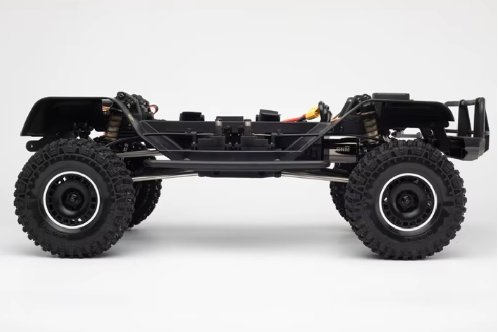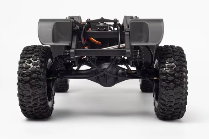 El YK4107 PRO equipa portal axles que aumentan el despeje y mejoran la distribución de torque. Su suspensión usa amortiguadores metálicos llenos de aceite que ofrecen articulación suave y estable en terrenos irregulares. La tracción 4x4 con diferenciales bloqueables, junto con la función Tank-Turn, permite maniobras extremas que otros crawlers no pueden ejecutar. El nuevo chasis LCG reduce el centro de gravedad, aumentando la estabilidad en rampas y pasos técnicos.