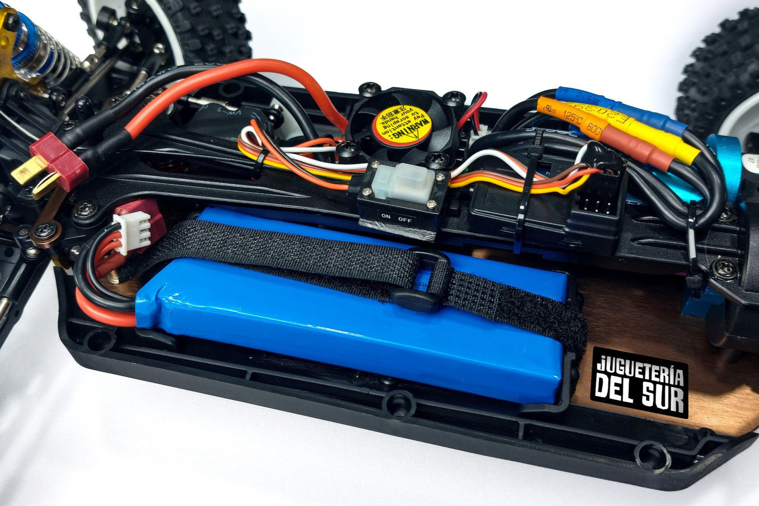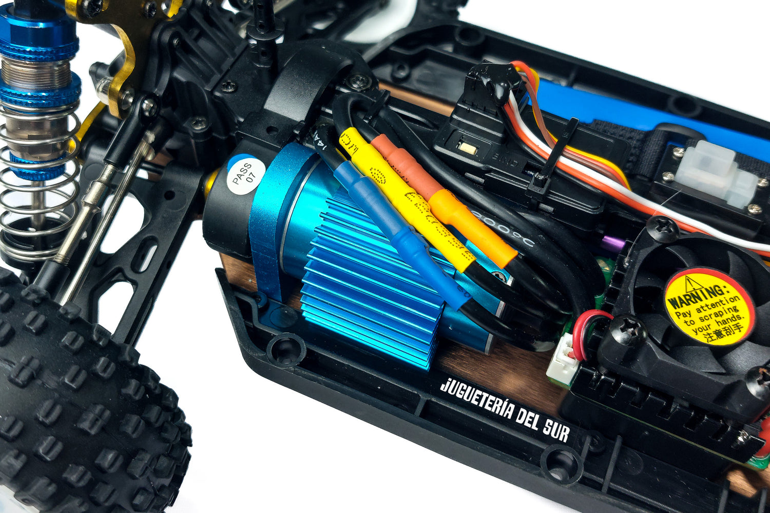 Equipado con un motor sin escobillas (brushless) modelo 2845 de 4300 KV, diseñado para ofrecer una potencia impresionante. Este motor es capaz de generar una velocidad máxima de hasta 75 km/h, gracias a su capacidad para operar con baterías 2S y 3S, el rendimiento del motor puede ajustarse, permitiendo alcanzar una aceleración rápida y una velocidad tope superior en diferentes configuraciones. El motor incluye un disipador de calor para evitar el sobrecalentamiento, lo que asegura que el vehículo mantenga un rendimiento estable durante largas sesiones de uso.